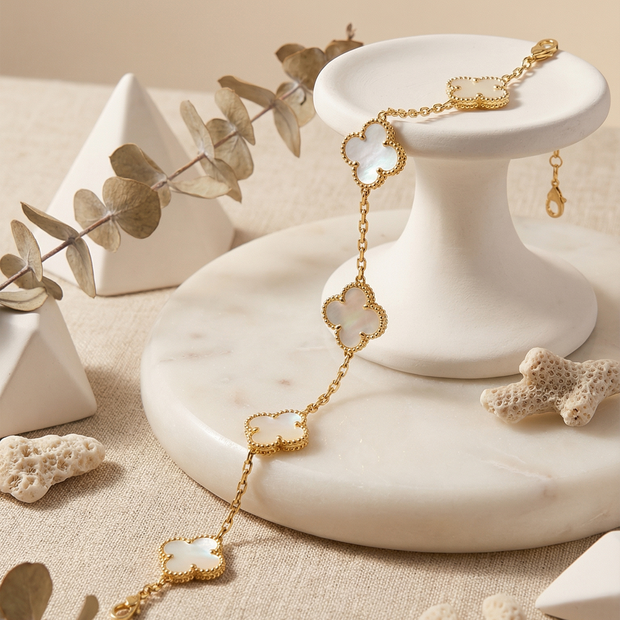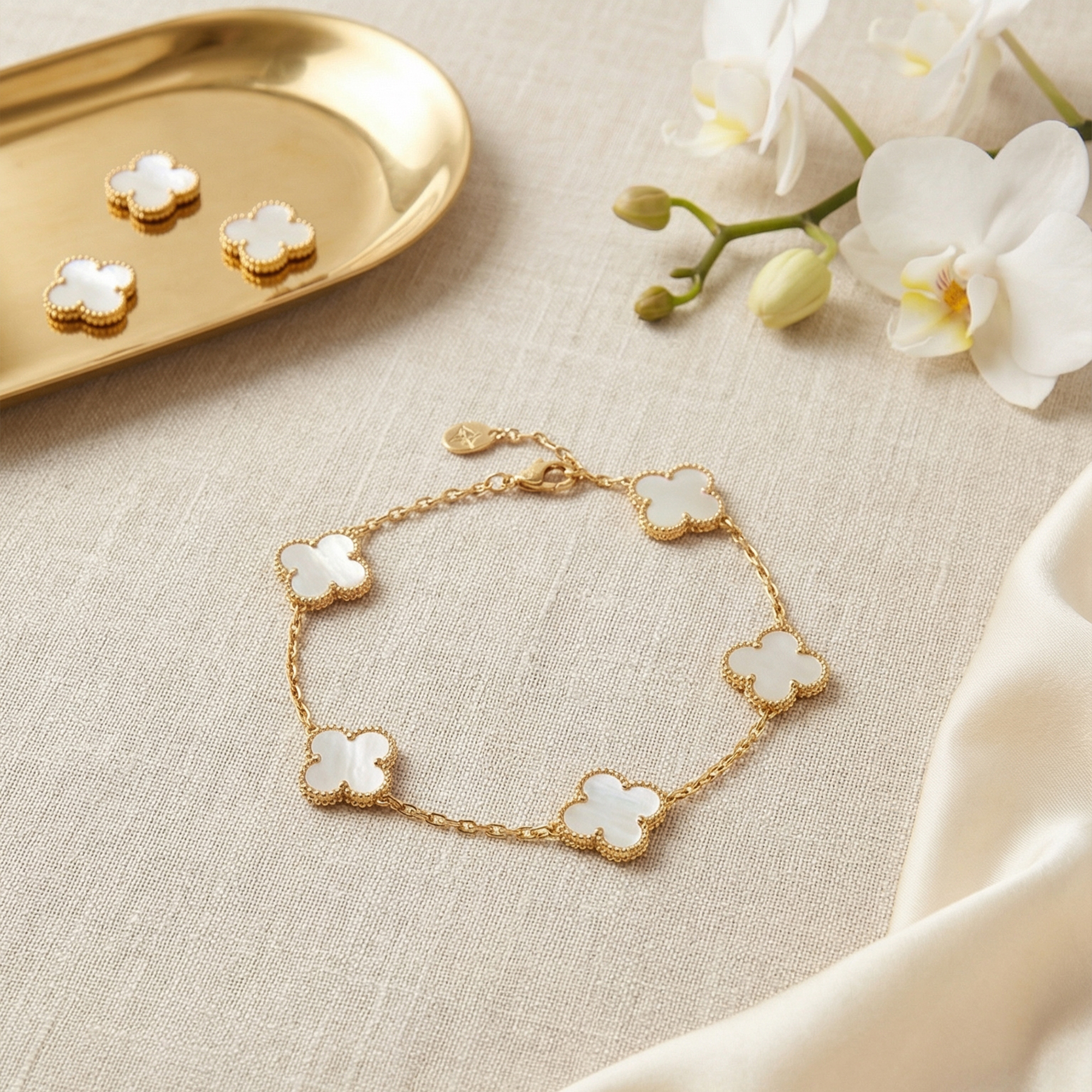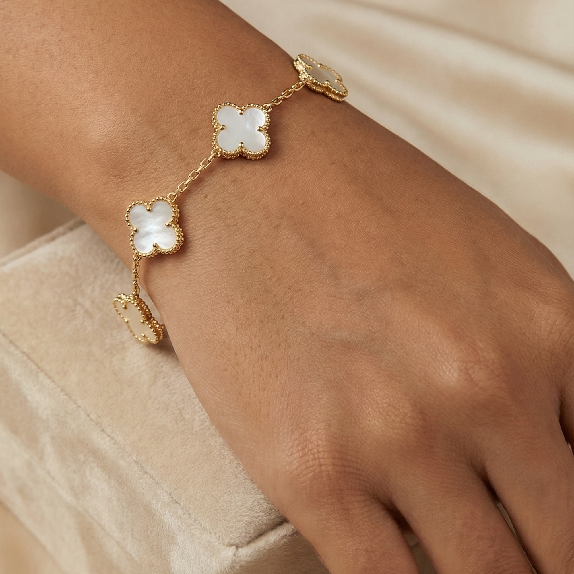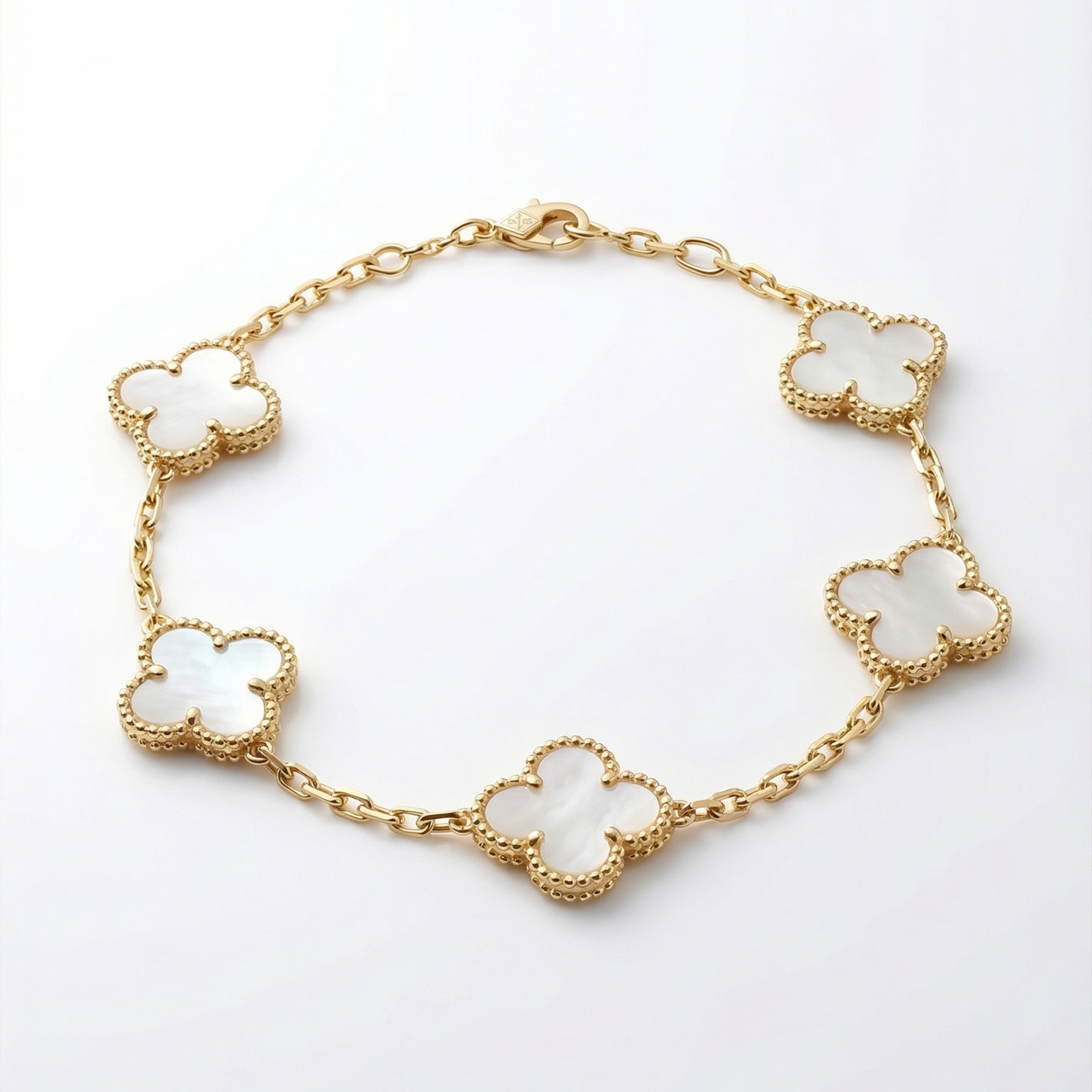 Elevate your jewelry collection with this stunning Four Leaf Clover Bracelet, a symbol of good fortune and sophisticated style. Each of the five motifs is inlaid with high-quality mother of pearl, offering a natural iridescence that complements any outfit—from casual daytime wear to elegant evening attire.